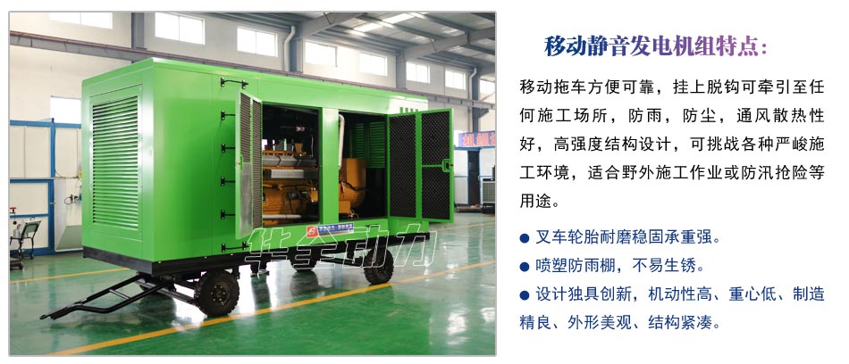 移動靜音發(fā)電機組特點: 移動拖車方便可靠,掛上脫鉤可牽引至任何施工場所,防雨,防塵,通風散熱性好,高強度結(jié)構(gòu)設(shè)計,可挑戰(zhàn)各種嚴峻施工環(huán)境,適合野外施工作業(yè)或防汛搶險等用途。