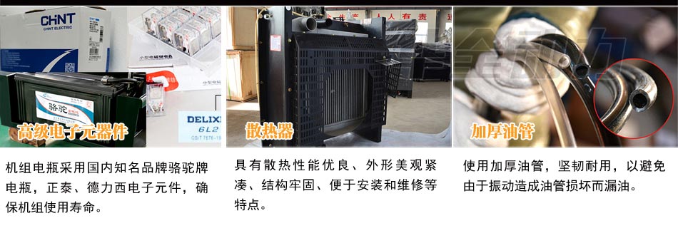 機組電瓶采用國內(nèi)知名品牌駱駝牌電瓶,正泰、德力西電子元件,確保機組使用壽命。
